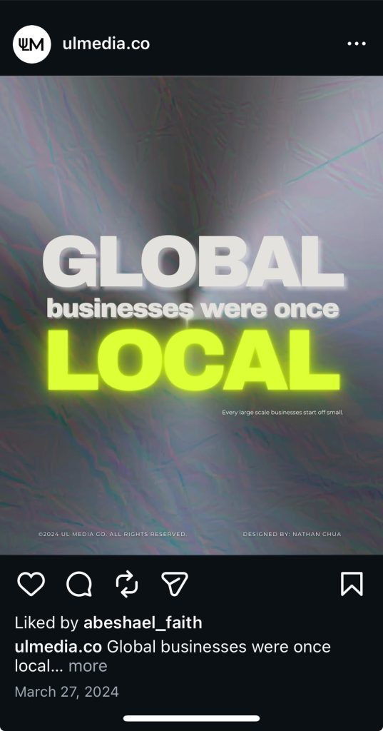 The visual hierarchy highlights the contrast between “global” and “local,” using bold typography and color to draw attention to the core message. The design was developed to support UL Media’s brand voice while inspiring small and emerging businesses to focus on sustainable growth and community impact.