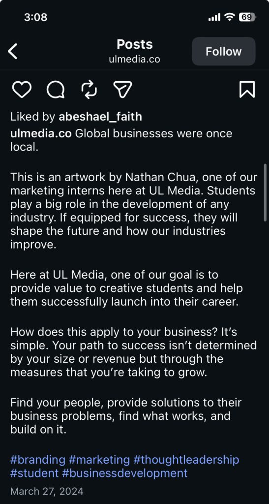 This project was created on Canva and then shared on social media for UL Media’s brand awareness initiative that also spotlighted student contributions and creative talent within the company.
